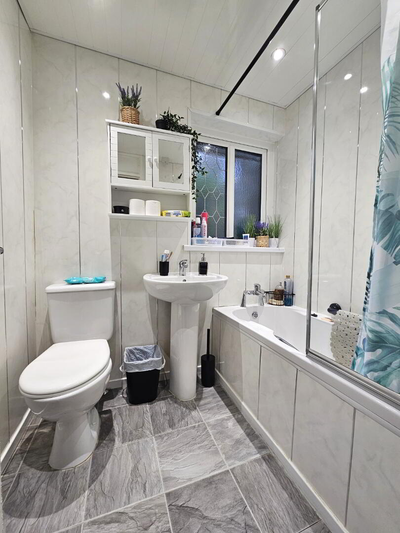 - Pvc panel bathroom with 3 piece suite and over bath shower
