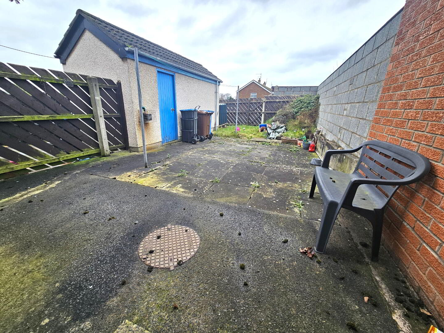 Garden in lawn to front with side access alley, fully enclosed to rear with paved patio area and fencing, masonry outhouse with ofch boiler within
