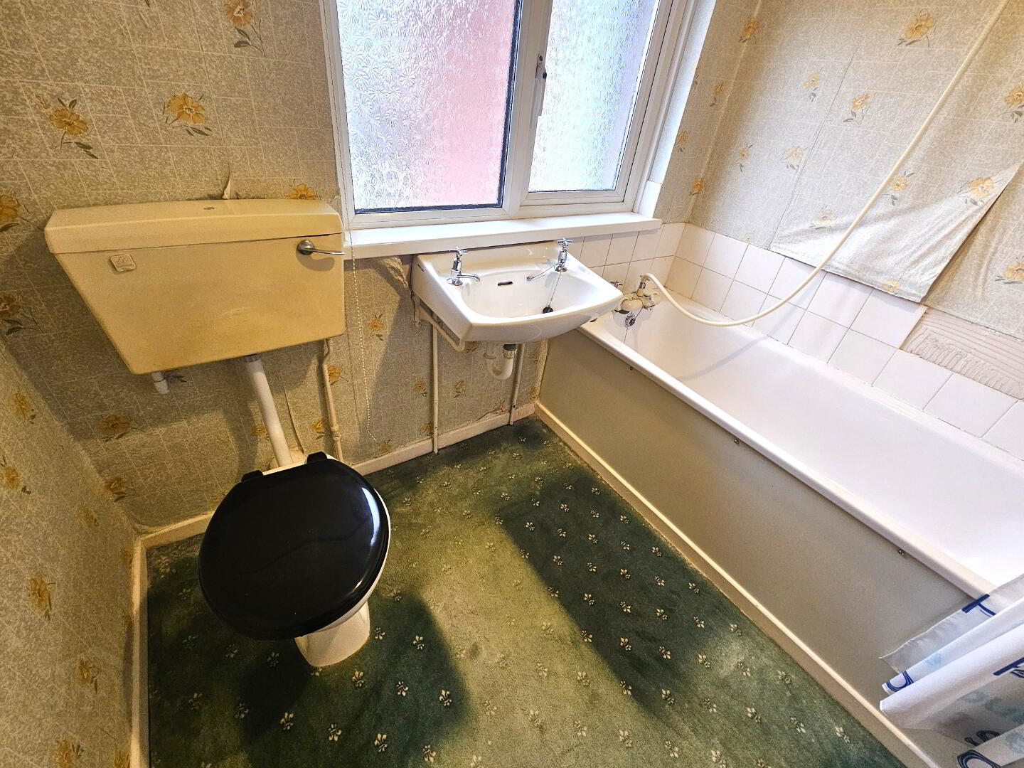 White suite consisting of panel bath with taps, wall hung wash hand basin with taps, low flush w.c., white splashback tiles, radiator.