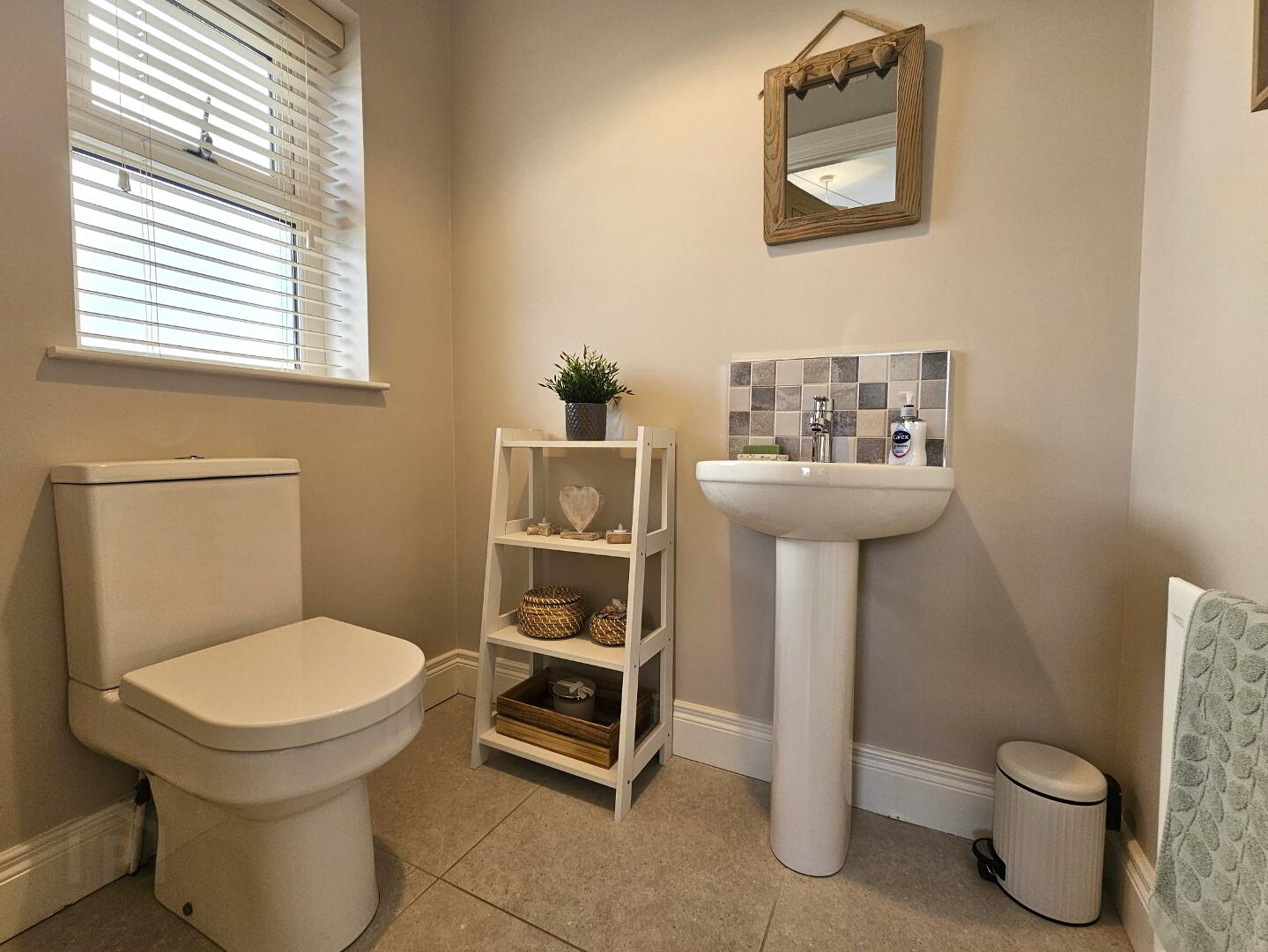- En suite with white w.c., sink with white high gloss vanity and shower enclosure