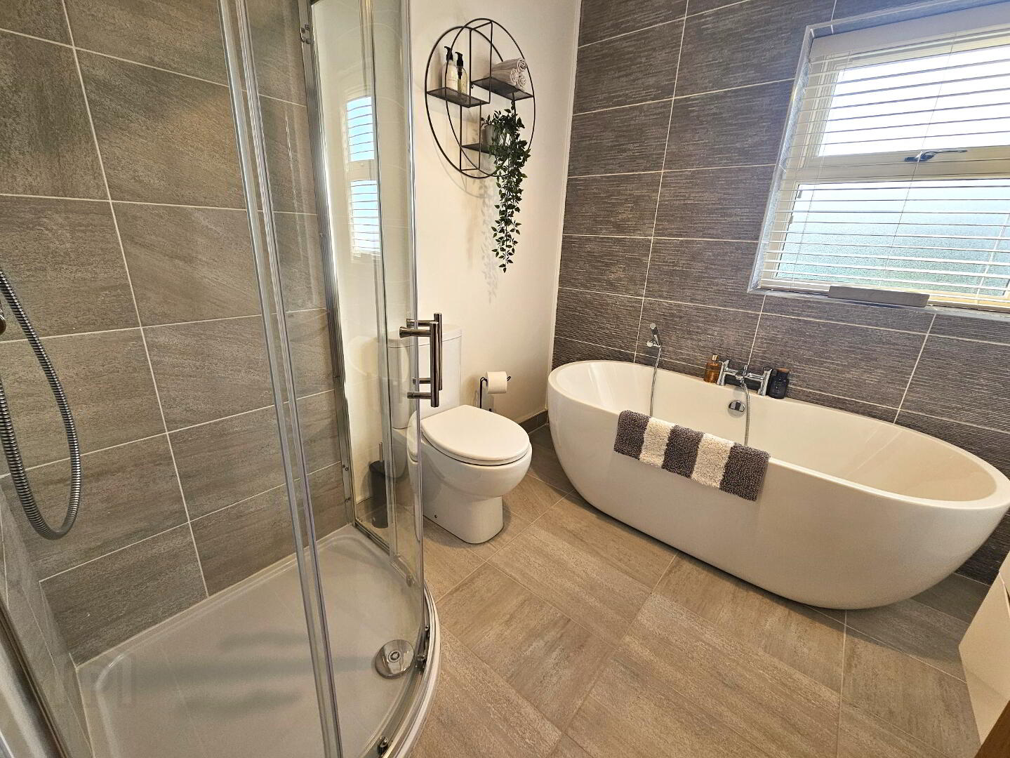 - White bathroom suite with w.c., double ended free standing bath, sink with white high gloss vanity & separate shower enclosure