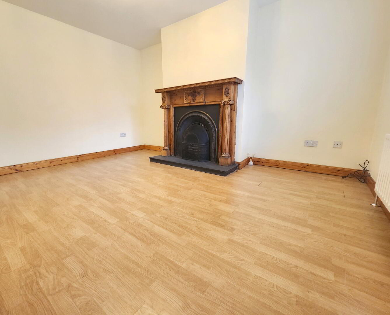 - Lounge with laminate flooring, feature fireplace with open fire facility