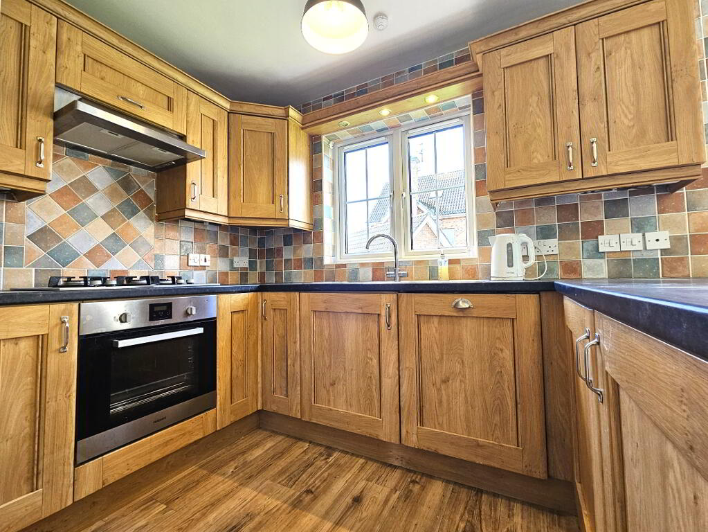 - Oak kitchen with integrated gas hob, electric oven, dishwasher, fridge & freezer