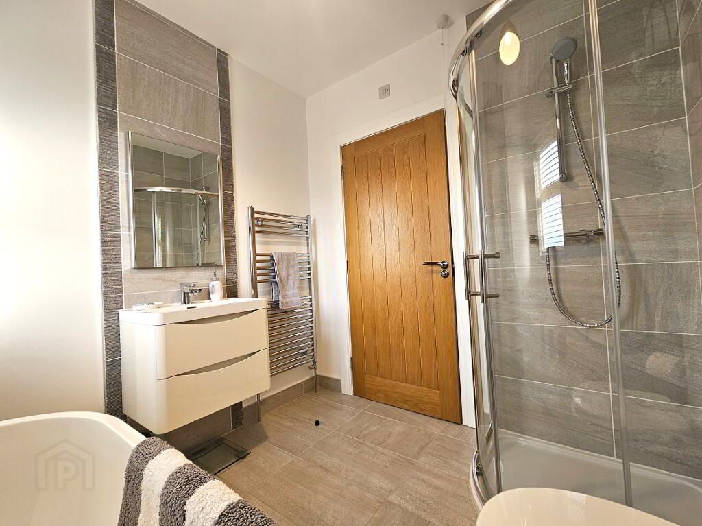 - White bathroom suite with w.c., double ended free standing bath, sink with white high gloss vanity & separate shower enclosure