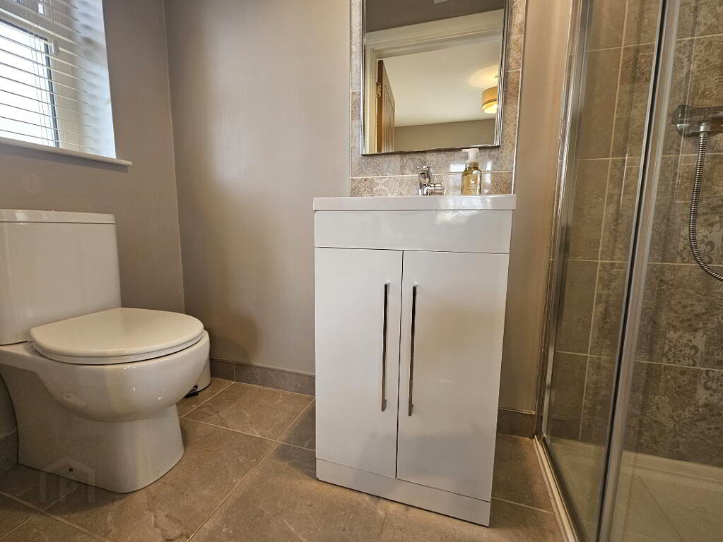 - En suite with white w.c., sink with white high gloss vanity and shower enclosure