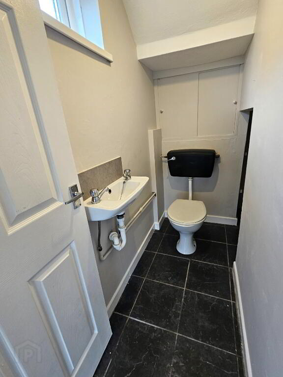 Ceramic tiled floor, white wall hung wash hand basin, white low flush w.c., electric fuse board