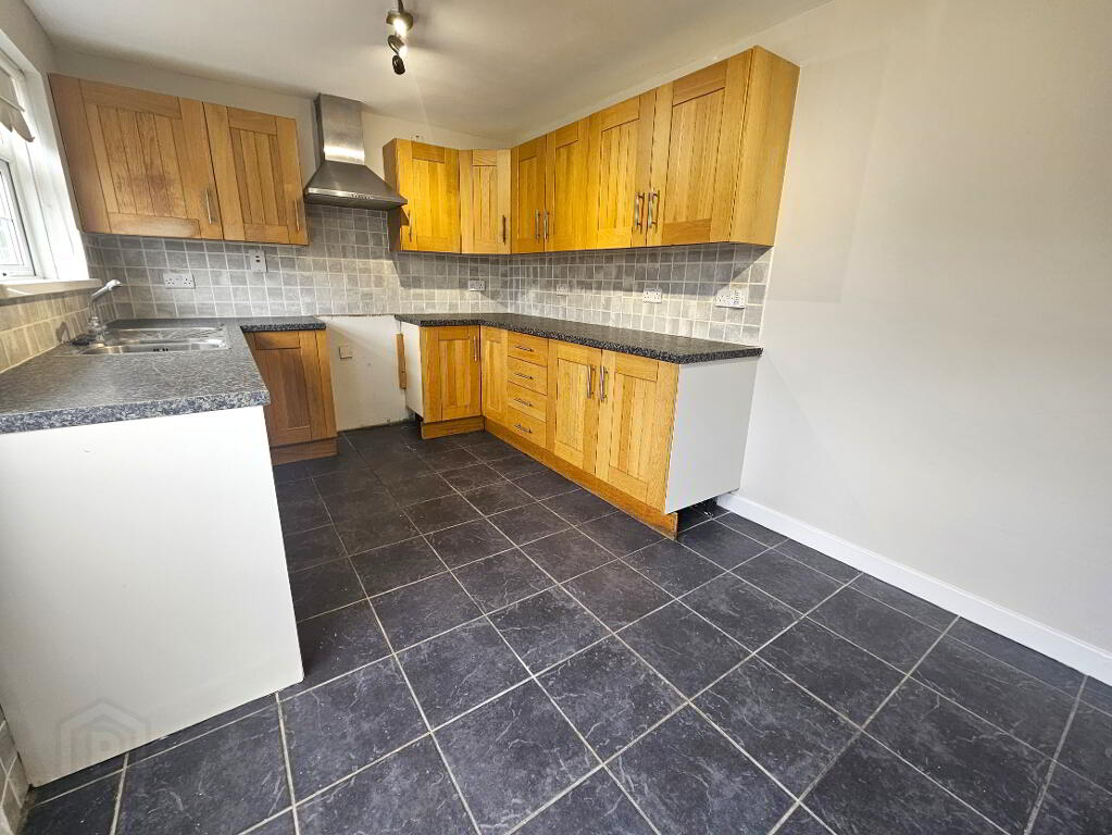 Full range of oak high and low level units with black laminate worktop, splashback tiling, ceramic tiled floor, stainless steel extractor fan, space cooker, space for washing machine, 11/2 stainless steel sink unit, radiator, pvc double glazed door.